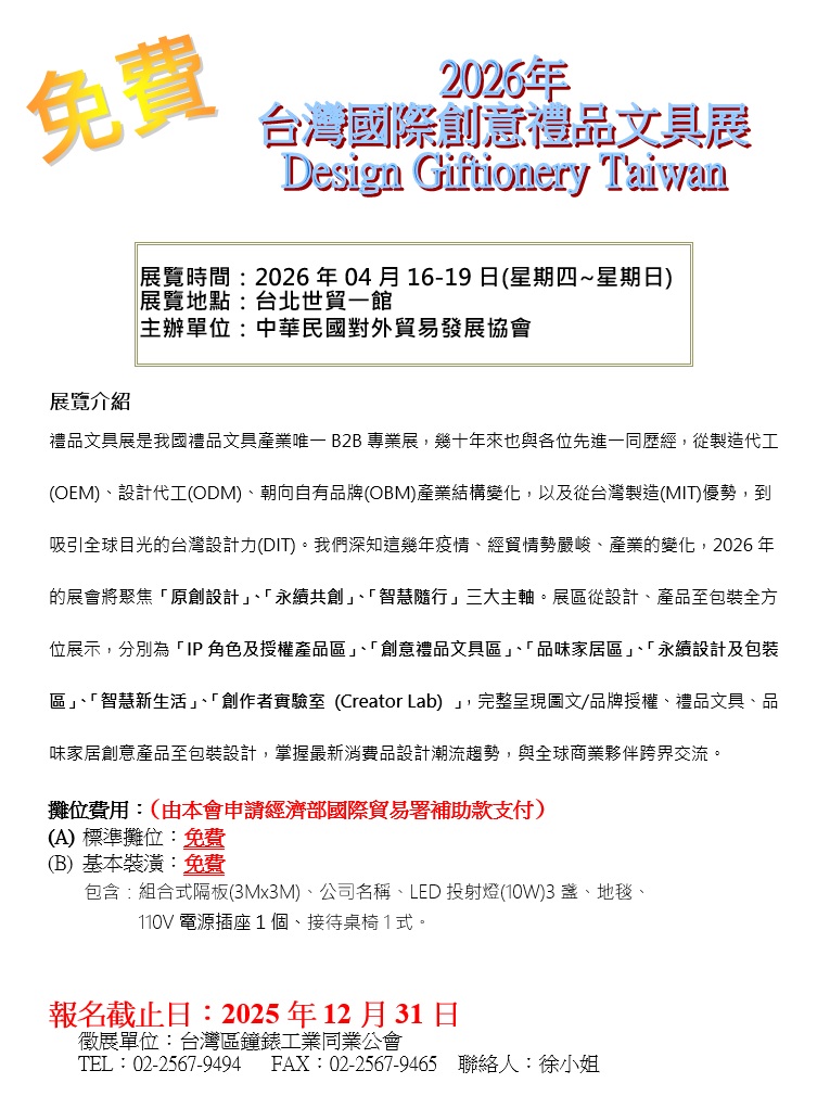 2026年 04月16-19日台灣國際創意禮品文具展 開始徵展囉!!!!!