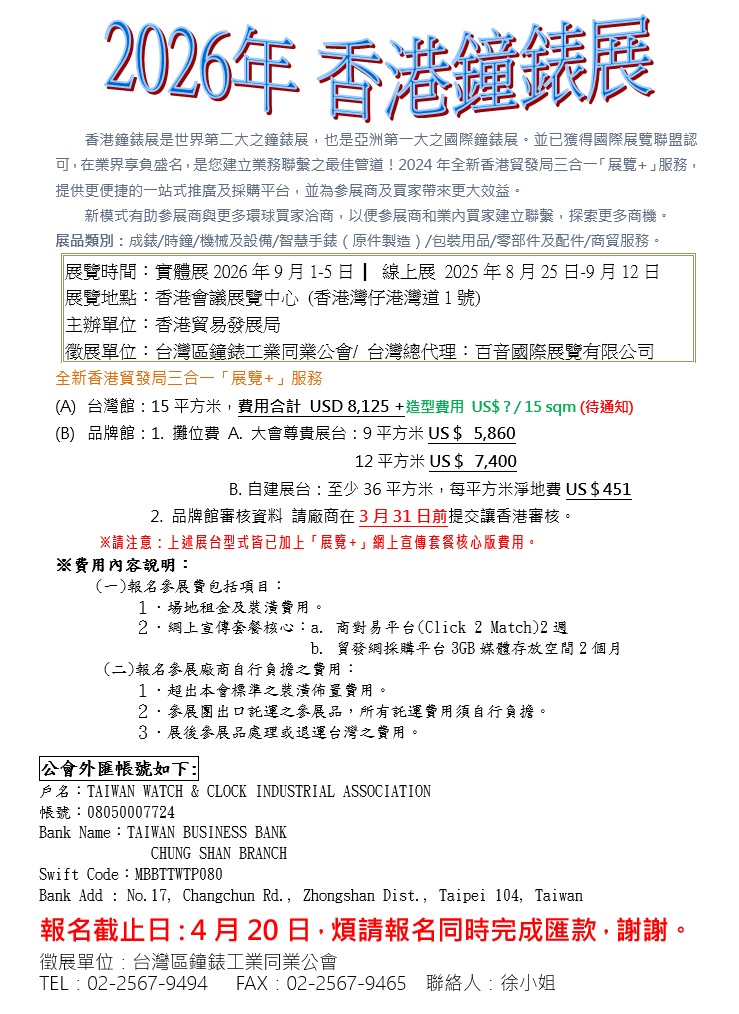 2026年 09月01-05日 香港鐘錶展 開始徵展囉!!!